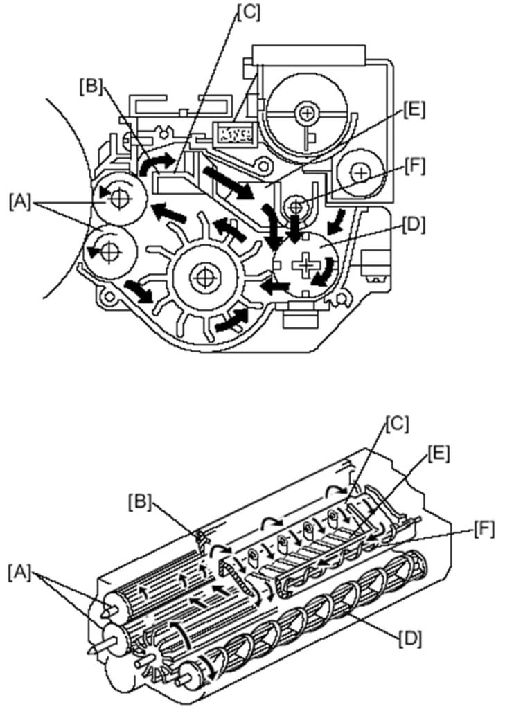 Mực được cấp từ trục mực (F) xuống trục đảo từ (D), ở đây từ và mực được trộn đều bởi trục đảo từ và trục khế, sau đó từ được đẩy vào trục từ, Từ được quay về trục đảo từ nhờ máng dẫn từ (C) và (E), Trục điều hoà từ (F) dùng để điều hoà cân bằng bột từ ở hai đầu trục từ, chống hiện tượng dồn từ về một bên.
