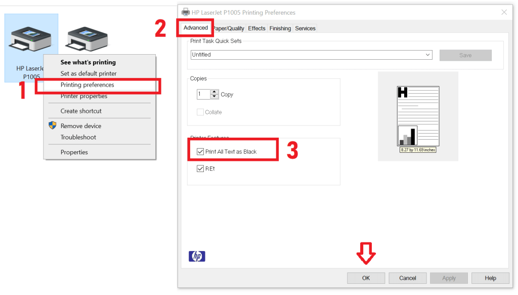 * Lưu ý hướng dẫn này không áp dụng hoàn toàn cho các dòng máy in và không phải máy in nào cũng có chế độ chỉnh đậm mực 'Print all text as Black' này.